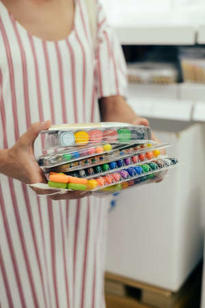 Mother choosing buying stationery in store preparing for first day in school. Closeup on buyer hands holding goods. Busy blurred shopping indoors background