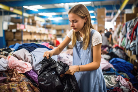 A young volunteer in yellow gloves cuts with scissors while sorting waste for recycling.