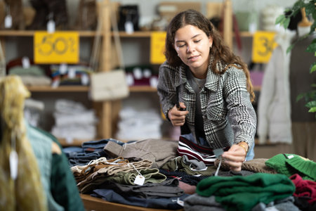 During November sales, young woman choose and buy something autumn clothes