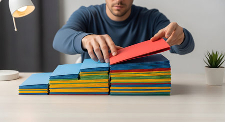 A man carefully organizes a large collection of colorful vintage stamps on a wooden table in a bright room.