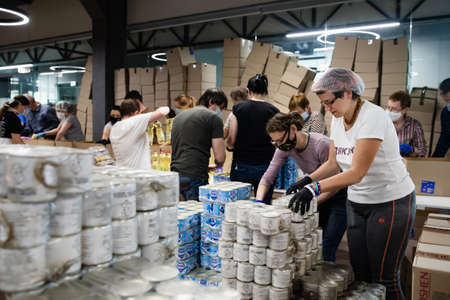 KYIV, UKRAINE - Apr. 04, 2020: Coronavirus epidemic in Ukraine and help to the poor. Thousands food packages from the Poroshenko Foundation sent to pensioners and people with disabilities