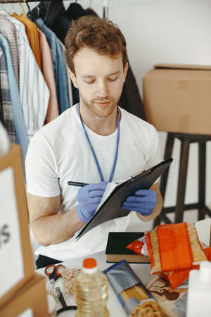Volunteer guy packs boxes with a humanitarian help