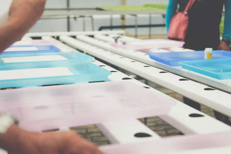 Hands of unrecognizable male worker of plastic recycling factory sorting bottle caps into various containers by workplace