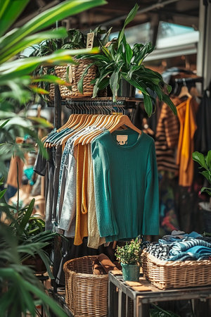 Scene depicting vintage bicycle and variety of clothing in store having sale sign. Clothing racks and accessories are visible in background enhancing cozy shop atmosphere