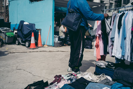 ordinary Afro-American guy considers sacond hands clothes on flea market