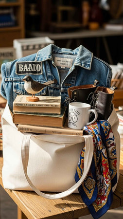 A variety of recycled and upcycled items are creatively arranged, showcasing fashion, accessories, and everyday objects for sustainable living.