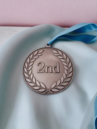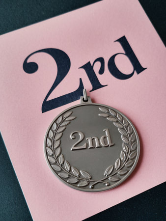A shiny silver medal with '2nd' inscribed, placed on a pink backdrop featuring bold lettering.