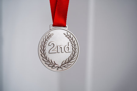 Silver medal awarded for second place, hanging on a vibrant red ribbon.