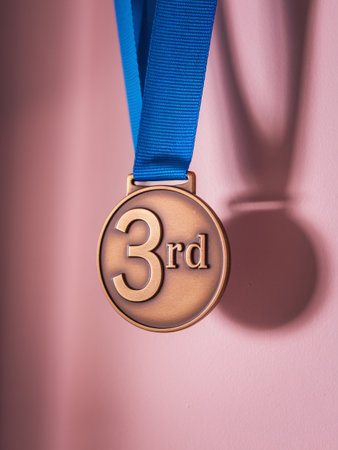 A bronze third place medal hanging on a blue ribbon against a soft pink background.