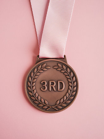 Bronze medal with '3RD' engraved, hanging on a pink ribbon against a soft pink background.