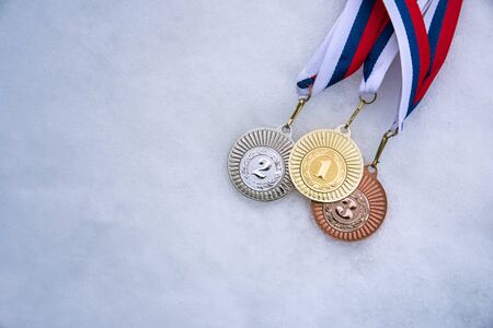 Gold silver and bronze medal set on white snow, medal ceremony on winter game, sport photo, white edit space,