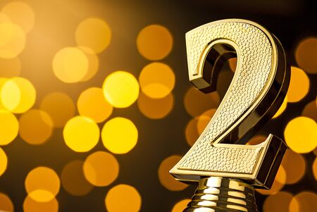 Second placed runner up gold award trophy over a festive background of golden bokeh effect party lights
