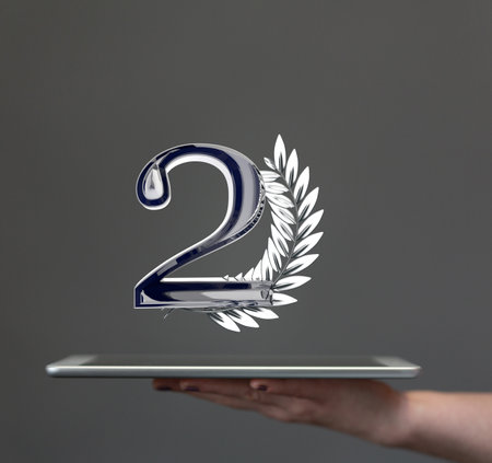A 3d silver rendering of 2 with laurel wreath hovering over a tablet - anniversary and success concept