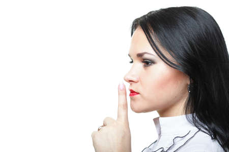 Young woman brunette girl asking for silence white isolated