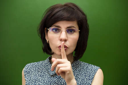 Portrait of young woman. Girl asking for silence or secrecy with finger on lips hush hand gesture on green