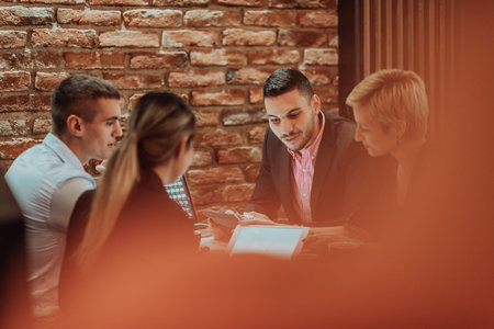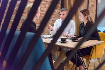 Full concentration at work. Group of young business people working and communicating while sitting at the modern coffee shop.