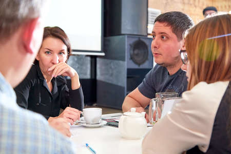 Kirov, Russia - September 25, 2019: People at table in small cafe or restaurant during intellectual game. Hungry group waiting for the waiter to get the menu or food