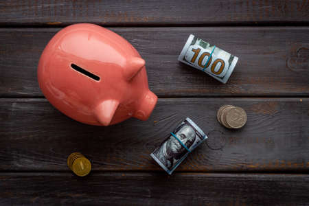 one hundred dollar bill and coins, money, piggy bank with currency bill on table. Business growth concept, finance and investment concept