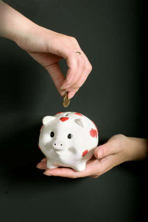hand inserting a money coin into the piggy for saving money wealth in concept of economy and crisis