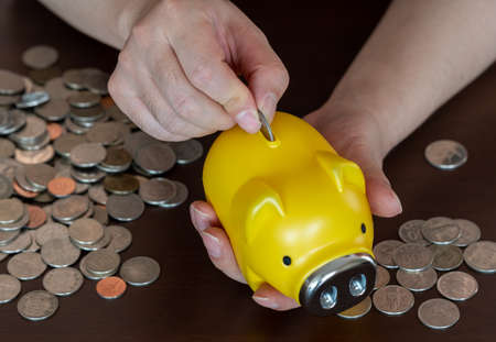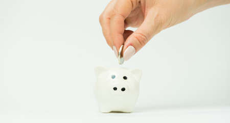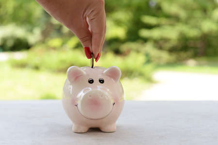 Hand putting money coin into piggy for saving money. Wealth and financial concept.