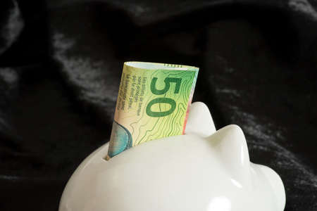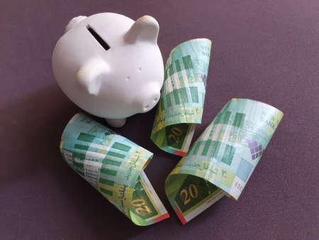 white piggy bank and Israeli banknotes of twenty shekels
