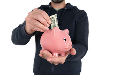 midsection of man holding piggy bank in one hand and inserting dollar bill into it with the other