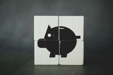 Investment and saving concept. Wooden cube block puzzle with piggy bank image