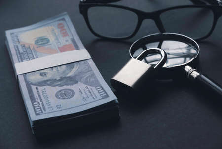 A money, magnifying glass, glasses and padlock on a black background.