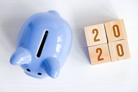 Blue piggy bank with numbers new year 2020 on cubes on white background. Overhead view. Concept of care of savings in coming year.