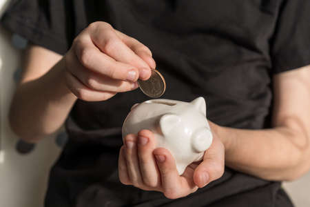 little kid investor putting a coin into piggy bank. indoor financial concept.