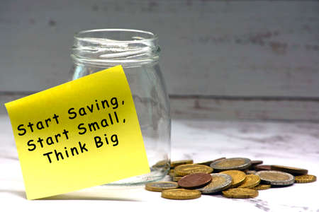 Text on yellow sticky note with blurred glass jar and coins on table surface - Start saving, start small, think big