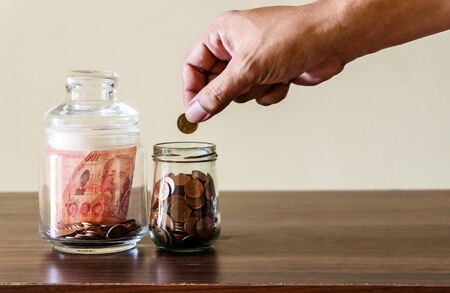 man put on national coinsin to square glass bottle with money sign on wood block