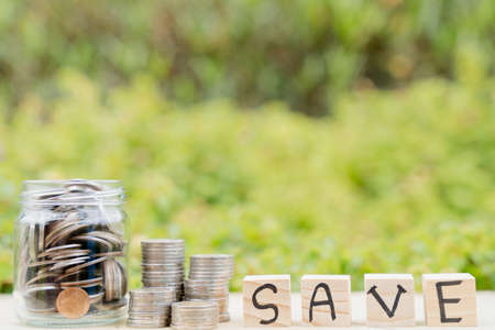 Save word on wooden block and jar full of coins on blurred green natural background. Saving money and investment concept.