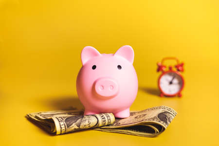 Pink piggy bank with dollar bills and alarm clock on yellow background