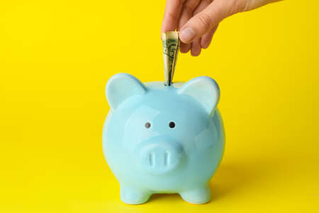 Money in the Bank, deposits and personal accounts, concept. Investments and savings, bright yellow background. A hand reaches out to cash