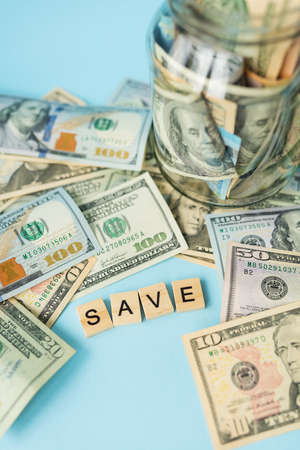 Dollar bills in glass jar and text save on wooden table