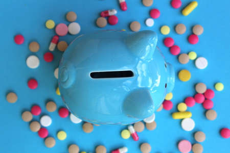 Piggy piggy bank stands on pills on a blue background