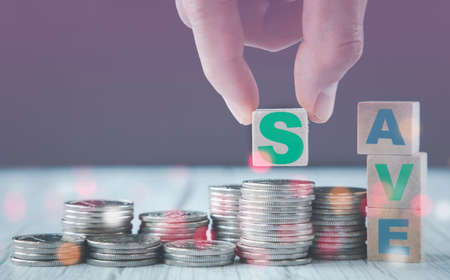 Hand holding and stacking wooden cube block which print screen US dollar sign for saving progress concept.