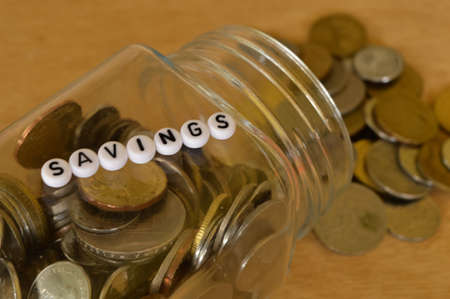 Stack of coins and alphabet beads with text SAVINGS. Financial concept.