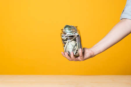 Man hands with glass jar full of US dollars. Saving money concept.