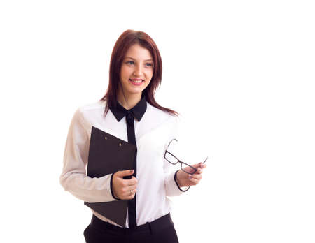 Close up of a beautiful businesswoman with a folder. Isolated white background.