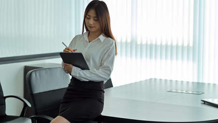 Business woman at work in black shirt and black dress in meeting room