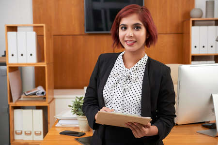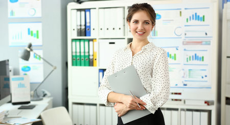 Young business woman or manager standing at workplace with folders