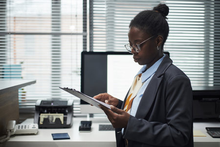 Young adult Black woman standing in bank office reviewing documents on clipboard, wearing glasses and business attire, focused on paperwork with office equipment in background