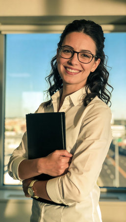 A confident and friendly young businesswoman with glasses and dark curly hair, wearing a white shirt, smiles while holding a black folder in a bright, modern office space.