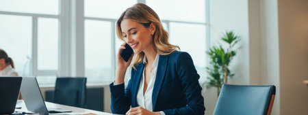 Corporate employee in business suit, interacting with client over phone, female worker in modern office, exemplifying customer service, client interaction at work, desk job in contemporary workplace