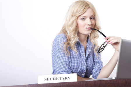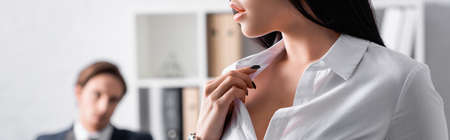 passionate secretary touching blouse while flirting with businessman on blurred background, banner