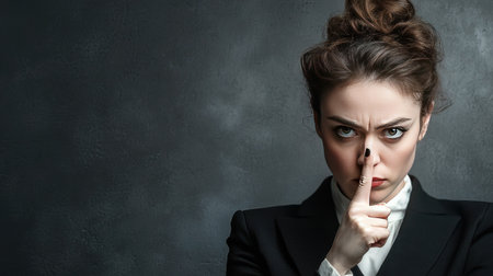 A young woman with a serious expression, dressed in a black suit, holds her index finger to her lips, signaling for silence or secrecy.