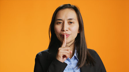 Filipino person shows hush gesture on camera, doing mute sign to keep secret and be private. Woman putting finger over lips for silence, asking for secrecy against orange background.