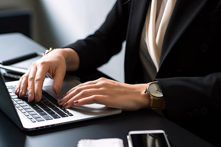 Confident businesswoman sits in a modern office, with a laptop and coffee cup on the table, exuding professionalism and focus.